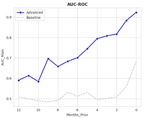 Figure 1. Area Under the Curve (AUC) scores for both Comprehensive Exam Readiness Model (Advanced) and Assessment Based Probability of passing (Baseline). Month 0 indicates actual test dates.