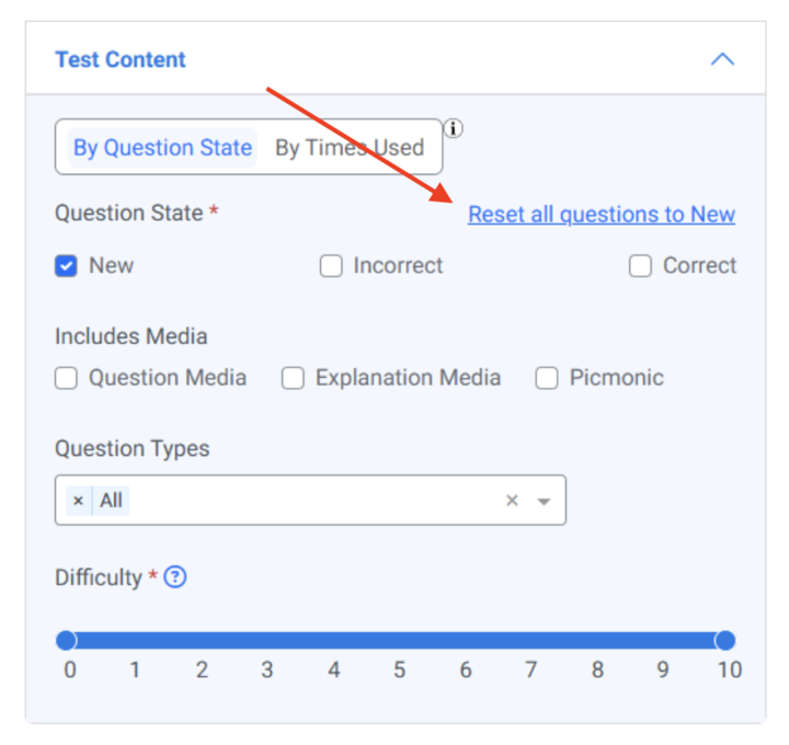 Members can reset their question status to “New” at any time. Resetting questions to “New” will not affect previously completed tests, quizzes, or assessments, and all performance statistics will remain intact. Please note that this action is irreversible. To maximize your learning, we recommend using this function only after you have completed all available questions at least once.