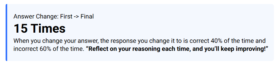 - Answer Changed From Correct to Incorrect – Shows how many times you originally selected the correct answer but changed it to an incorrect one before submitting.