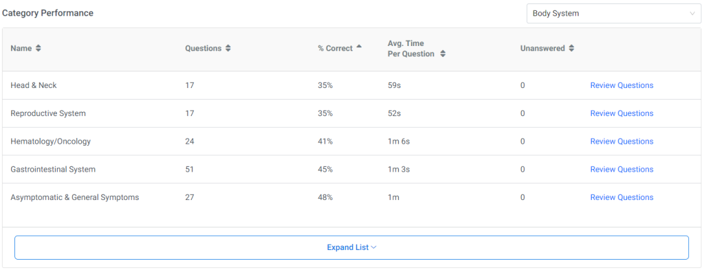 The Category Performance table reports your performance for all categories tested by the assessment. The drop-down menu above the Category Performance shows you the currently selected category. For example, in Figure 6, the category currently selected is Body System. You may click on the drop-down menu and select a different category. The Category Performance table will automatically update to report your performance by the category you selected.