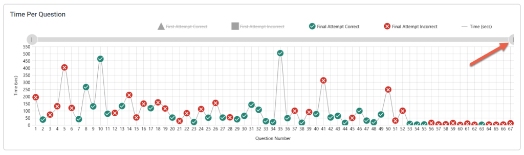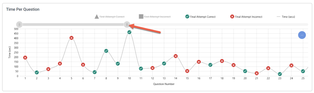 The Time Per Question graph displays up to 25 questions upon loading the report. To view more questions in the graph, select the right-hand endcap on the grey slide bar above the graph and drag it to the right to display more questions in the graph. Alternatively, move your cursor over the graph and use the mouse scroll button to zoom out and in.