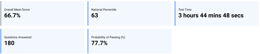 While the purpose of the Score Prediction is to give you a prediction for whether you will pass or fail your real-world exam based on your mock assessment performance, it is very important to remember that your prediction is just that – a prediction! Your prediction is not fate and may be wrong. There are many factors that may influence your prediction, such as how you felt when you took the mock assessment and the time between you taking the mock assessment and your real-world exam. Predictions are educated guesses, and all guesses sometimes turn out to be wrong. You should never rely only on your Score Prediction to determine if you’re ready to sit for your real-world exam. Remember to consult with your faculty advisor and holistically consider other measures of test readiness. The Score Prediction is only one data point. You should also carefully review how you performed by category and topic to identify areas of weakness and consider the Overall Mean Score along with your Test Time to develop an appropriate study plan leading up to your exam.