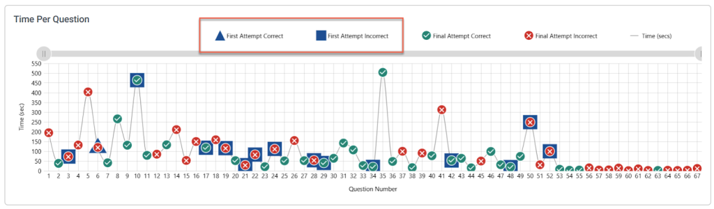 By default, the decision analysis portion of the graph is turned off, but you can click the “First Attempt Correct” and “First Attempt Incorrect” legend above the graph to see where you changed answers. When turned on, your first attempt on a changed answer will be shown as a blue triangle (correct) or a blue square (incorrect).