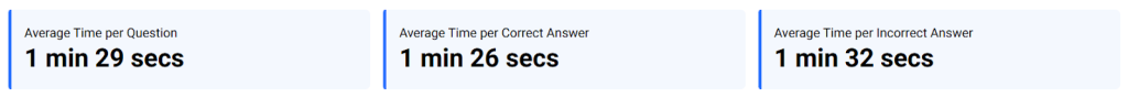 The Average Time per Question, Correct Answer, and Incorrect Answer cards provide insight into these respective areas for tests or quizzes taken in Timed Mode.