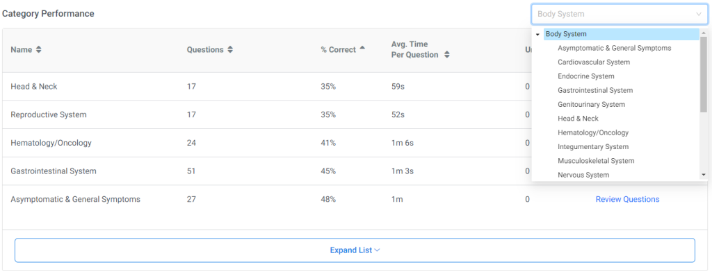 The Category Performance table reports your performance for all categories tested by the assessment. The drop-down menu above the Category Performance shows you the currently selected category. For example, in Figure 6, the category currently selected is Body System. You may click on the drop-down menu and select a different category. The Category Performance table will automatically update to report your performance by the category you selected.