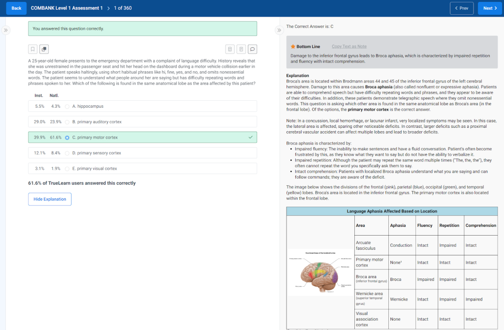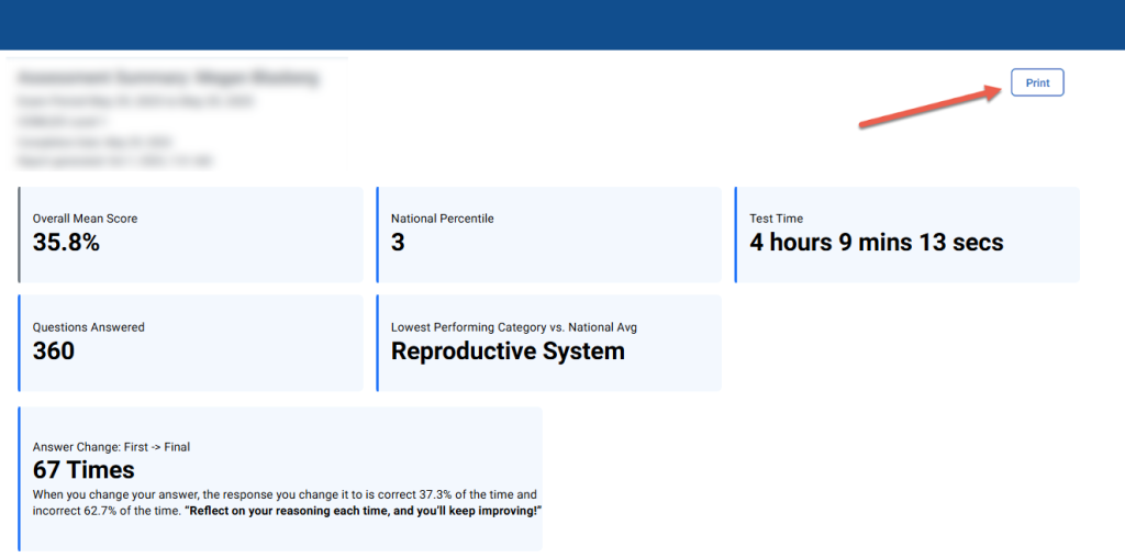It can be very tempting to focus on your Overall Mean Score, Grad Year Percentile, and National Percentile, and either think, “I don’t need to study anymore” or “I’m never going to pass my exam.”. While knowing how you stack up against other learners who completed the assessment is useful, don’t assume you don’t need to study anymore or give up. The data in the Assessment Summary Report will help to identify the material where you underperformed and target your study to improve your understanding of these content areas.