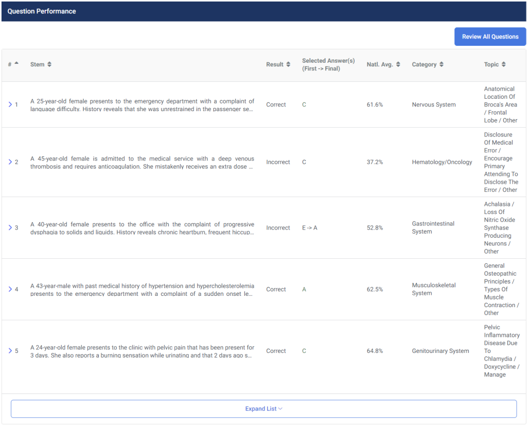 The Question Performance table is critical for helping you to identify where you need to target your study for improvement. It shows you how you performed on each question and allows you to directly target individual questions for review. Let’s learn about a few ways that you can use it in your review.